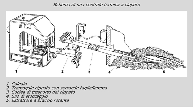 Poiché il caricamento del combustibile in caldaia avviene in modo automatico, è necessario che accanto al locale caldaia venga predisposto un locale (silo) per lo stoccaggio del combustibile. Al fine di facilitare le operazioni di scarico del cippato dai mezzi di trasporto, il silo è situato spesso al di sotto del piano stradale. Dal silo di alimentazione il cippato viene estratto automaticamente e convogliato, per mezzo di una coclea dosatrice, nella caldaia, dove avviene la completa combustione mediante l’immissione di aria primaria e secondaria. La combustione avviene in caldaie a griglia che può essere: