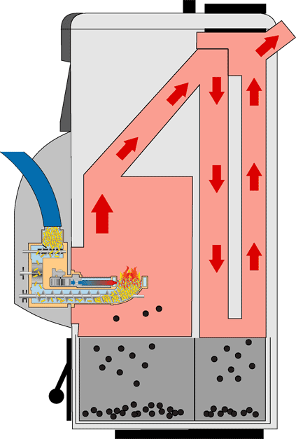 Anche le caldaie a pellets, come quelle a cippato, richiedono un contenitore per lo stoccaggio del combustibile situato in prossimità della caldaia. Da qui una coclea lo preleva e lo trasporta in caldaia, ove avviene la combustione. I bruciatori per pellet da utilizzare in caldaie a gasolio si applicano sulla parte anteriore della caldaia. Essi vengono alimentati dall’alto e bruciano il pellet sviluppando una fiamma orizzontale che si proietta nella caldaia, al pari di quanto avviene negli impianti a gasolio. In tutti i casi l’accensione è automatica e molto rapida, per mezzo di una resistenza elettrica. Nei sistemi più avanzati la regolazione dell’aria comburente e del flusso di combustibile vengono effettuate automaticamente ad opera di un microprocessore. Queste caratteristiche di semplicità d’uso e di automazione conferiscono agli impianti di riscaldamento a pellets un elevato livello di comfort.